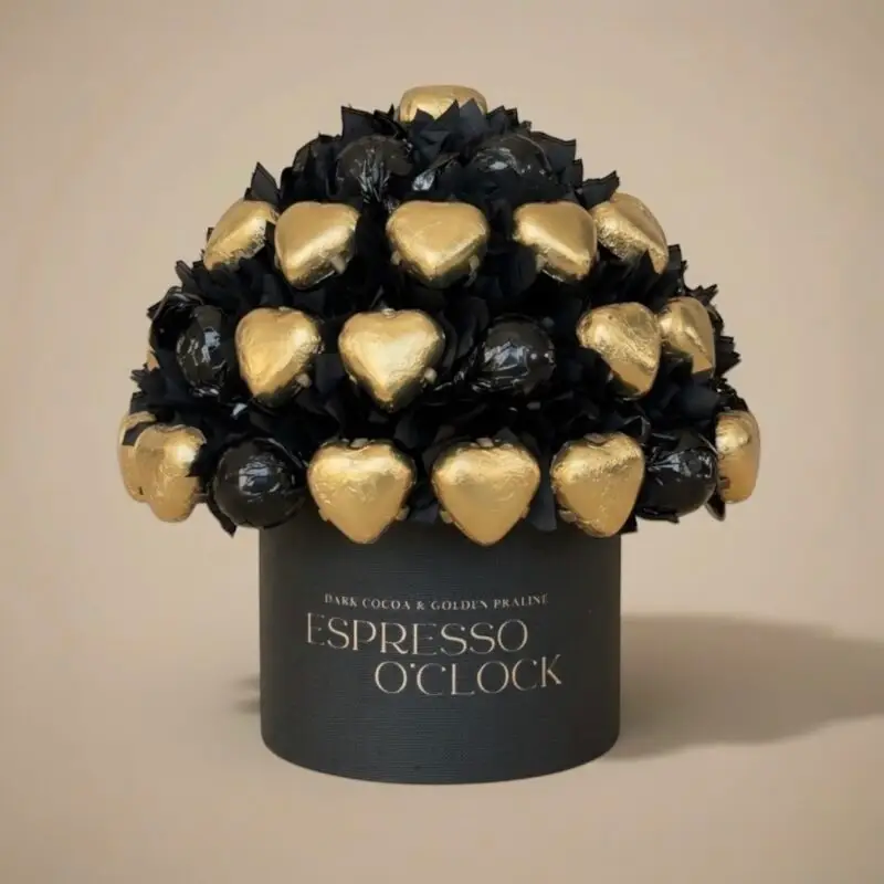 Til kaffe-elskeren! Denne delikate oppsatsen er fylt med espresso konfekter og italienske hjertepraliner. Perfekt hvis du vil overraske noen med en unik, uventet og premium gave.