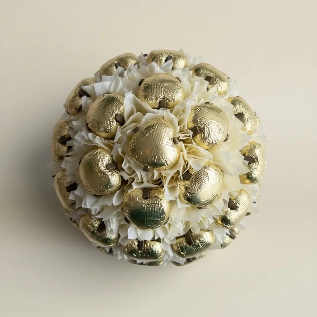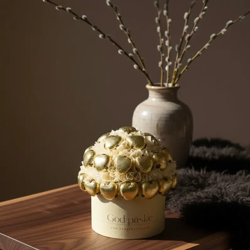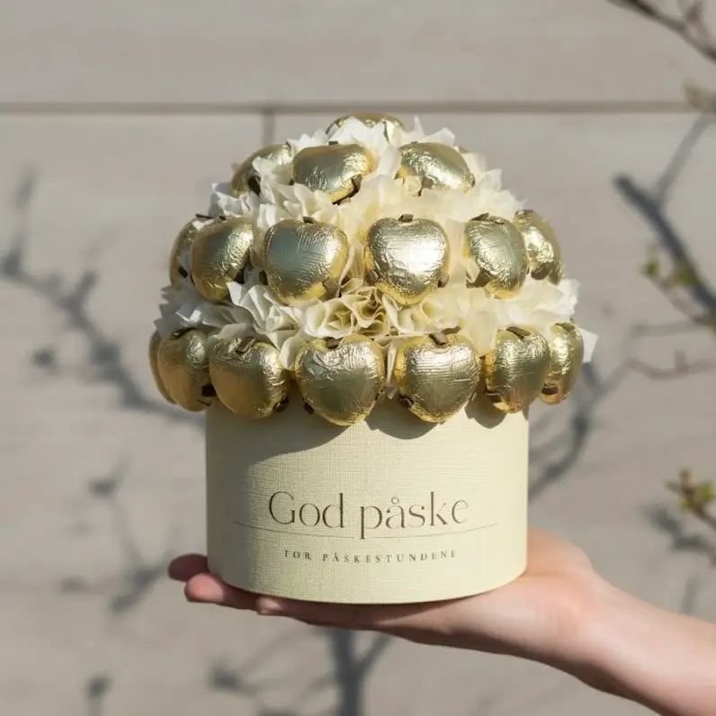En elegant sjokoladebukett fylt med gullskimrende melkehjerter, perfekt som en liten oppmerksomhet i påsken.
