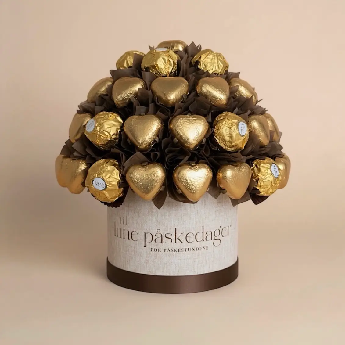 En blikkfangende påskeoppsats fylt med premium sjokolade. Det tekstillignende materiale og den balanserte fargepaletten gjør den til en elegant detalj på sidebordet eller midtpunkt på påskebordet.