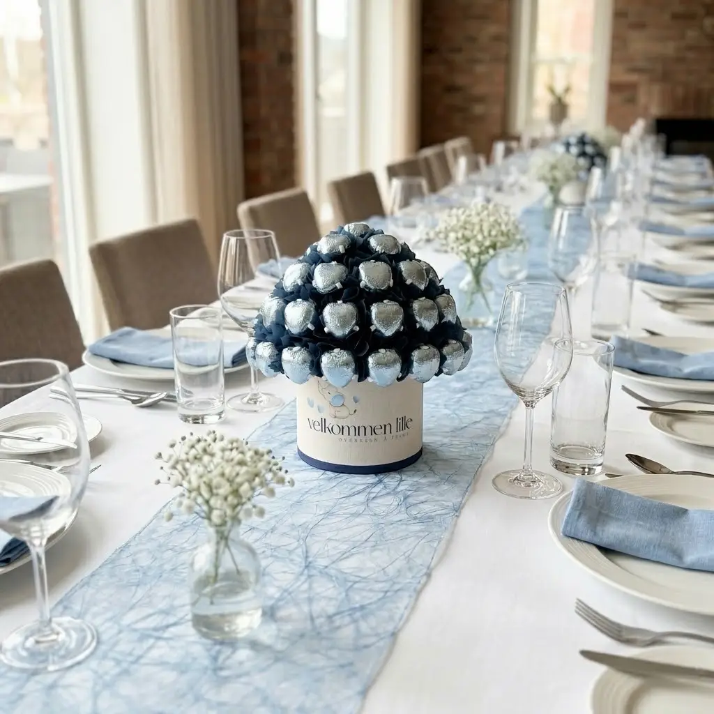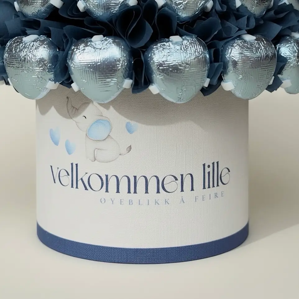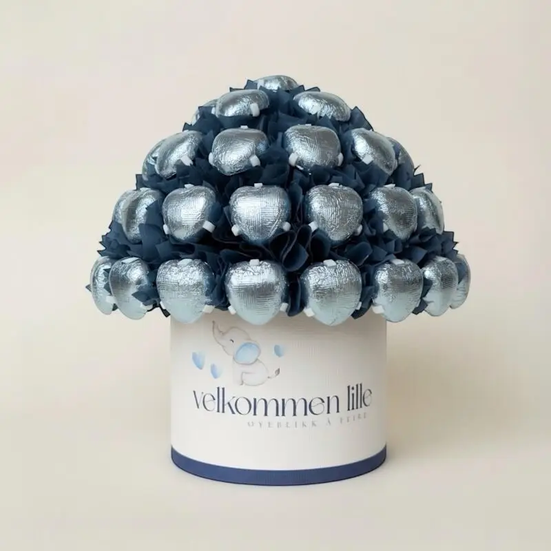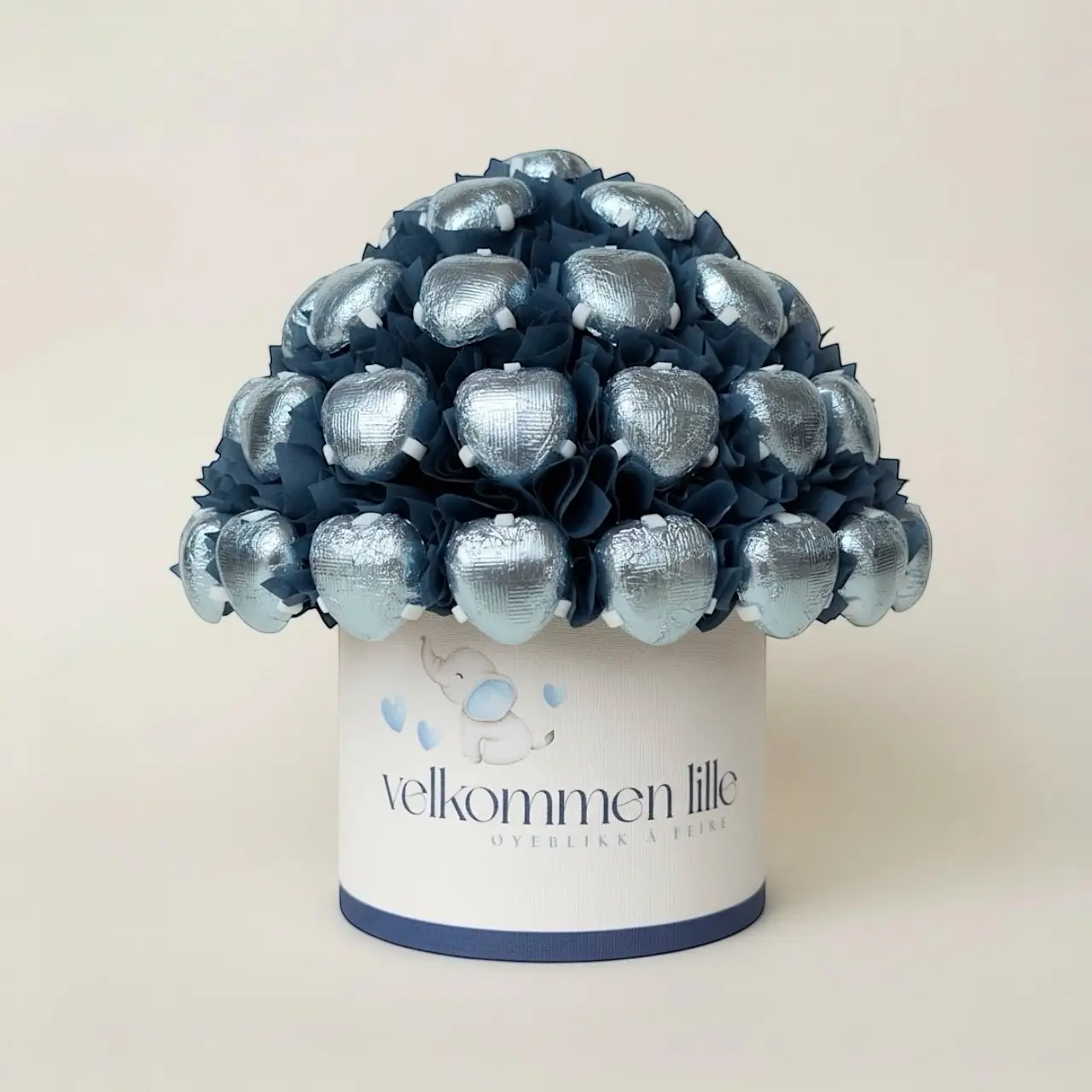 En søt oppmerksomhet til nybakte foreldre. Like vakker som gave, som den er som dekorasjon til babyshower og dåp. Fylt med klassiske melkesjokoladehjerter, et trygt valg som gleder de fleste.
