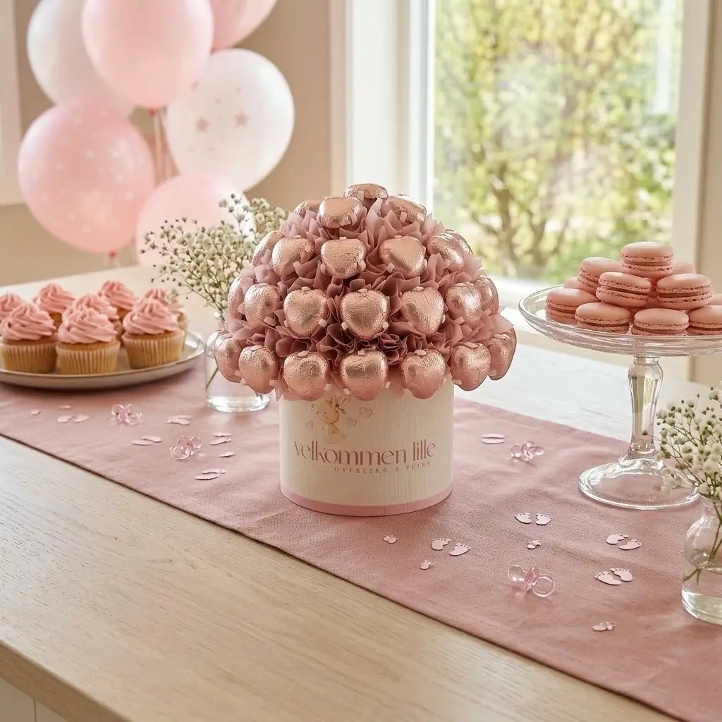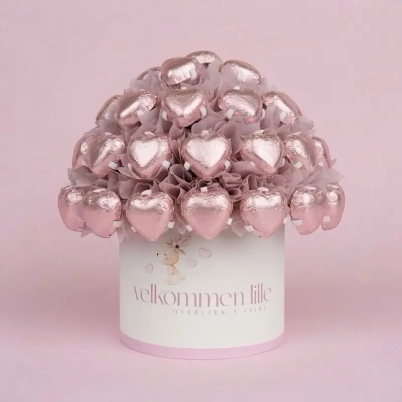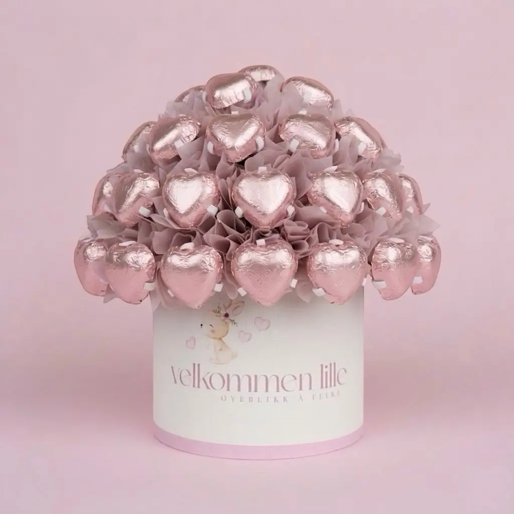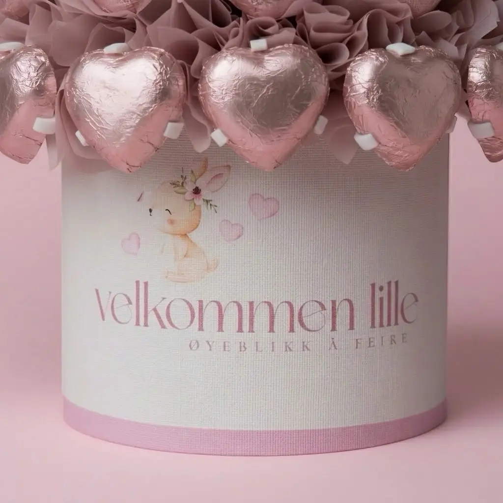 En søt oppmerksomhet til nybakte foreldre. Like vakker som gave, som den er som dekorasjon til babyshower og dåp. Fylt med klassiske melkesjokoladepraliner, et trygt valg som gleder de fleste.